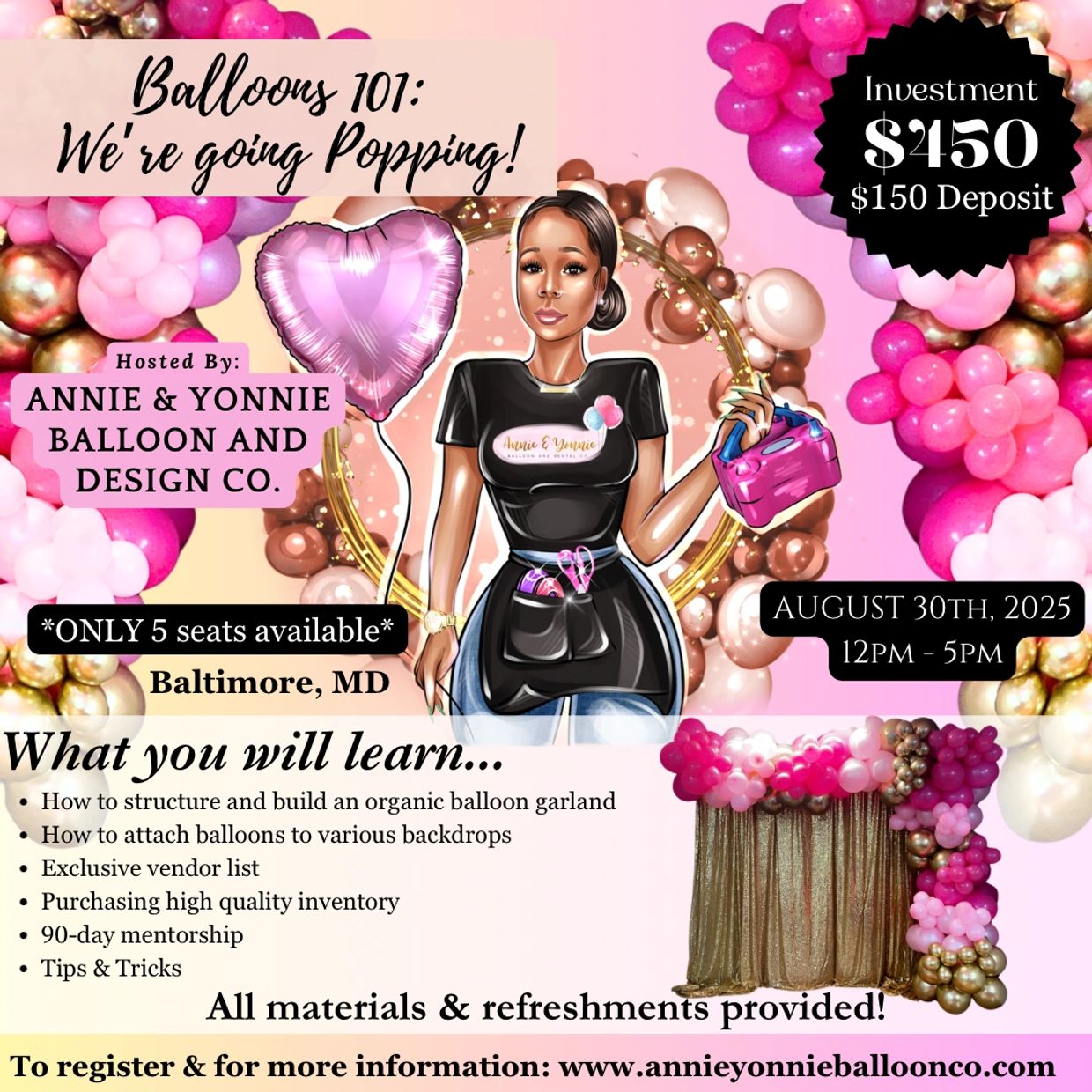 This interactive class focuses on building and structuring balloon garlands. You won't need to bring anything with you. ALL materials and lunch are provided!