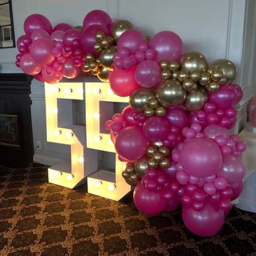 Two Balloon Garlands (3 color maximum), silver or gold sequin wall, loveseat (black, white, pink or blue) and neon sign (happy birthday, congratulations, cloud nine, baby in bloom, let’s party)